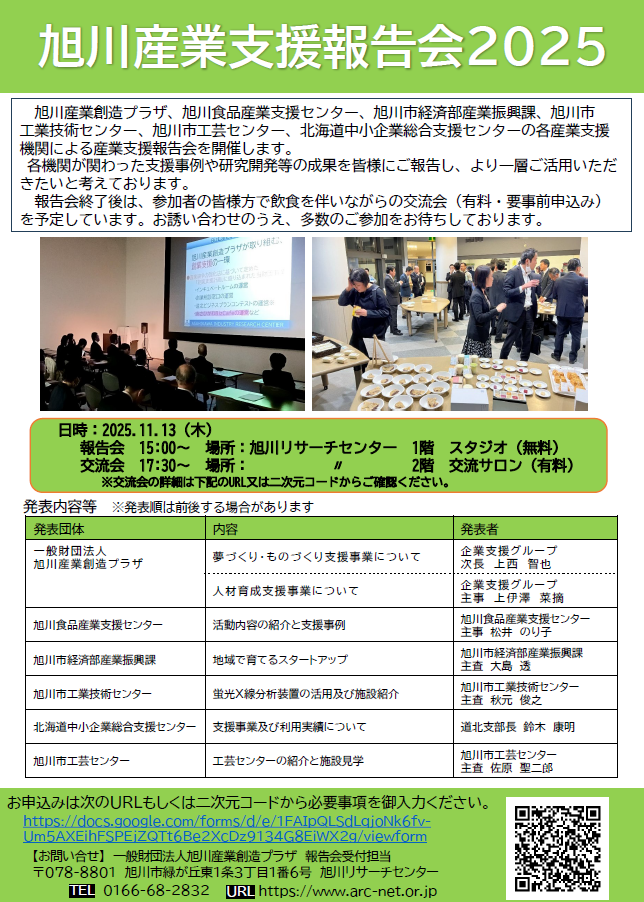 旭川の産業支援機関とともに、これまでの支援内容や研究開発等の状況について、関係者をはじめ多くの皆様に知っていただき、当財団をはじめ各機関の認知度を向上させて利用の促進及び、道北地域における産業の高度化、中小企業の振興を目的に次のとおり開催します。発表会終了後には、飲食を伴いながらの交流会も実施しますので、お誘い合わせのうえ御参加ください。