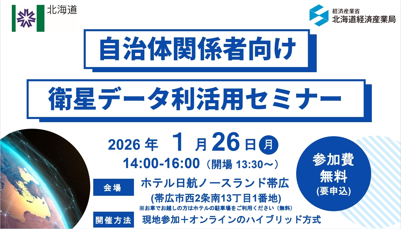 北海道経済産業局では、衛星データの実際の利活用事例を広く発信するため、十勝総合振興局との共催で「衛星データ利活用セミナー」を開催いたします。